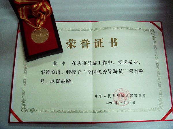 沈陽青旅員工童帥,在從事導(dǎo)游工作中,愛崗敬業(yè),實(shí)績突出,被中華人民共和國國家旅游局授予“全國優(yōu)秀導(dǎo)游員”榮譽(yù)稱號。