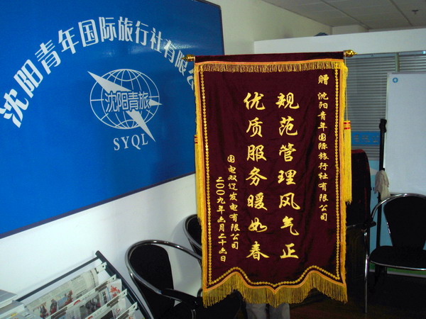 2009年6月30日,沈陽青旅出境中心再獲國電雙遼發(fā)電有限公司贈(zèng)予的錦旗,這是09年上半年來出境中心獲得客戶贈(zèng)予的第三面錦旗。