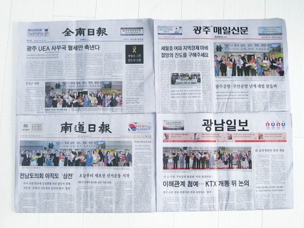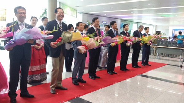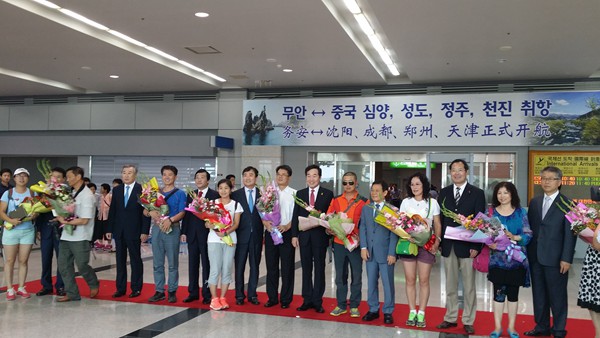 2014年7月16日,沈陽(yáng)青年國(guó)際旅行社韓國(guó)包機(jī)首發(fā)團(tuán)在董事長(zhǎng)倪琛善的帶領(lǐng)下落地韓國(guó)務(wù)安機(jī)場(chǎng),韓方舉辦了盛大而熱烈的啟航歡迎儀式。韓國(guó)光州廣域市市長(zhǎng)尹荘鉉、中國(guó)駐光州總領(lǐng)事王憲民、全羅南道知事李洛淵、全羅南道觀光協(xié)會(huì)會(huì)長(zhǎng)李江宇、務(wù)安郡郡守金澤州等領(lǐng)導(dǎo)對(duì)倪琛善董事長(zhǎng)及包機(jī)首發(fā)團(tuán)游客進(jìn)行親切友好的接待。雙方互贈(zèng)禮物,共同參加了韓方準(zhǔn)備的歡迎洽談宴會(huì)。