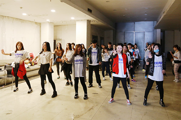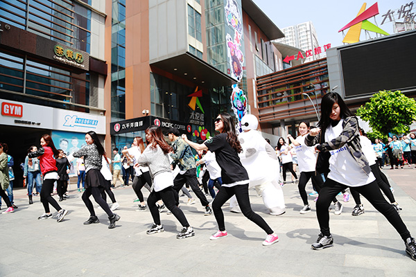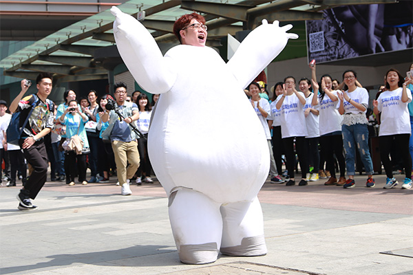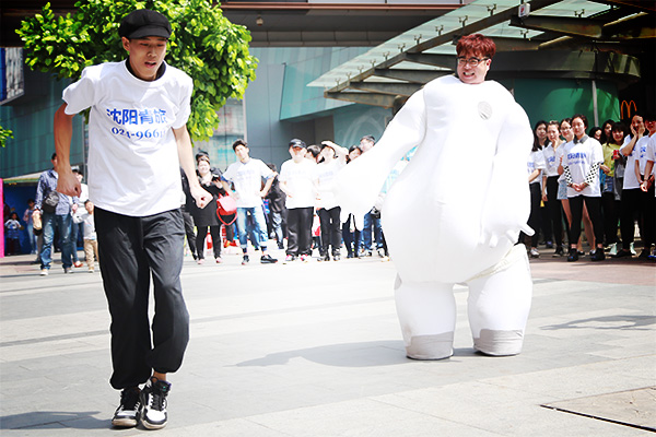 26日下午13:00,沈陽中街大悅城門前廣場像每個周末一樣人頭攢動,人們想平日一樣行走在周末擁擠的街頭。忽然,數(shù)十名年輕人從四面八方聚集至此,他們紛紛脫下自己的外套,方才還紛亂的街頭瞬間形成了一個整齊的方陣,同時還有一個可愛的“大白”人偶在方陣中間動感的跳舞,格外惹眼。這時候,人群中想起了音樂,原來是主持人大兵的新神曲《撓撓》,伴著勁爆的音樂,參與快閃的舞蹈演員們精彩的表演著節(jié)目,現(xiàn)場所有行人都不免駐足觀看。這時,大白將頭套摘掉,人群中爆發(fā)出了一陣尖叫——原來一直在人群中走動的“大白”竟然是著名主持人大兵。
