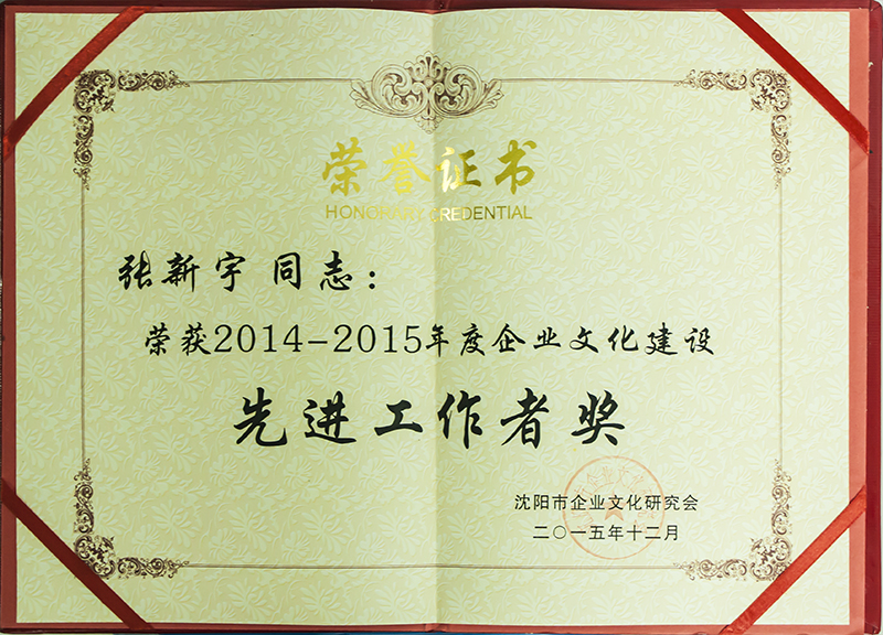 2015年12月15日,沈陽市企業(yè)文化研究會授予我社2014-2015年度企業(yè)文化建設(shè)優(yōu)秀單位獎,同時為我社張新宇總經(jīng)理頒發(fā)2014-2015年度企業(yè)文化建設(shè)先進(jìn)工作者獎!