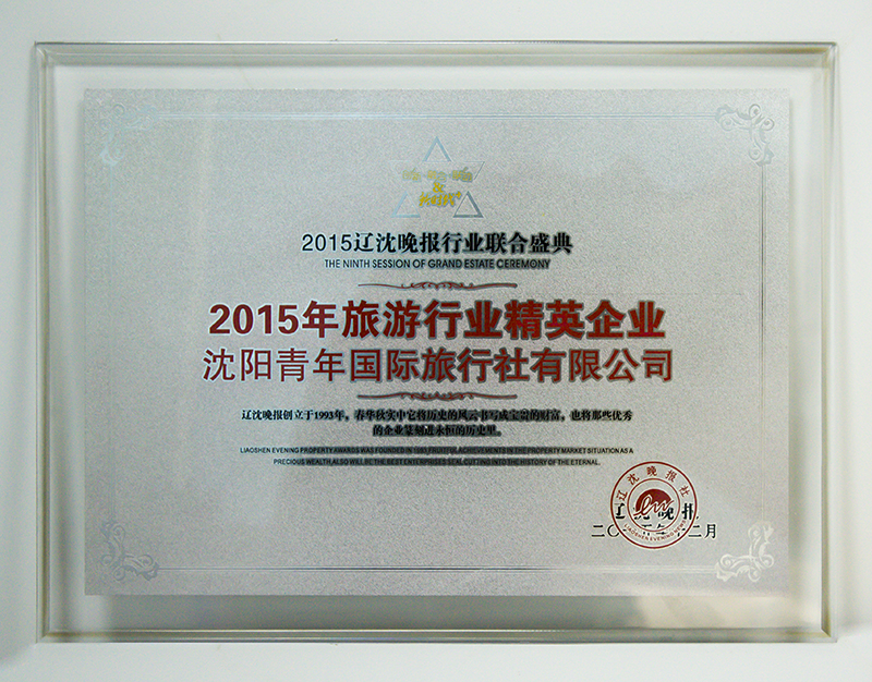 2015年12月22日,創(chuàng)新·融合·聯(lián)動(dòng)與新時(shí)代+”遼沈晚報(bào)行業(yè)聯(lián)合盛典在遼寧報(bào)業(yè)大廈5樓多功能廳隆重舉行,在此次盛典活動(dòng)中,沈陽(yáng)青年國(guó)際旅行社被評(píng)為《2015年旅游行業(yè)精英企業(yè)》!