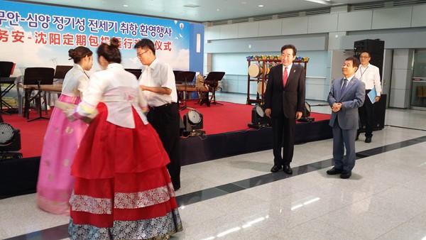 2014年7月16日,沈陽(yáng)青年國(guó)際旅行社韓國(guó)包機(jī)首發(fā)團(tuán)在董事長(zhǎng)倪琛善的帶領(lǐng)下落地韓國(guó)務(wù)安機(jī)場(chǎng),韓方舉辦了盛大而熱烈的啟航歡迎儀式。韓國(guó)光州廣域市市長(zhǎng)尹荘鉉、中國(guó)駐光州總領(lǐng)事王憲民、全羅南道知事李洛淵、全羅南道觀光協(xié)會(huì)會(huì)長(zhǎng)李江宇、務(wù)安郡郡守金澤州等領(lǐng)導(dǎo)對(duì)倪琛善董事長(zhǎng)及包機(jī)首發(fā)團(tuán)游客進(jìn)行親切友好的接待。雙方互贈(zèng)禮物,共同參加了韓方準(zhǔn)備的歡迎洽談宴會(huì)。