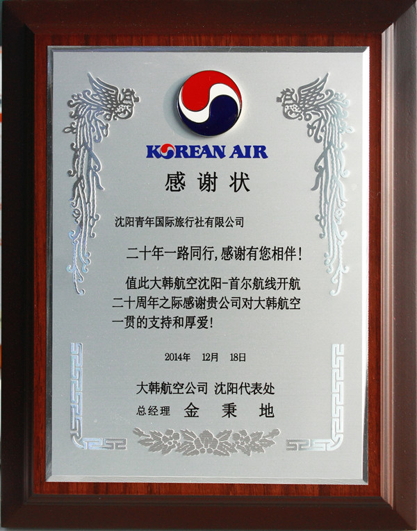 2014年12月18日 大韓航空沈陽-首爾航線開航二十周年之際為我社頒發(fā)感謝狀!