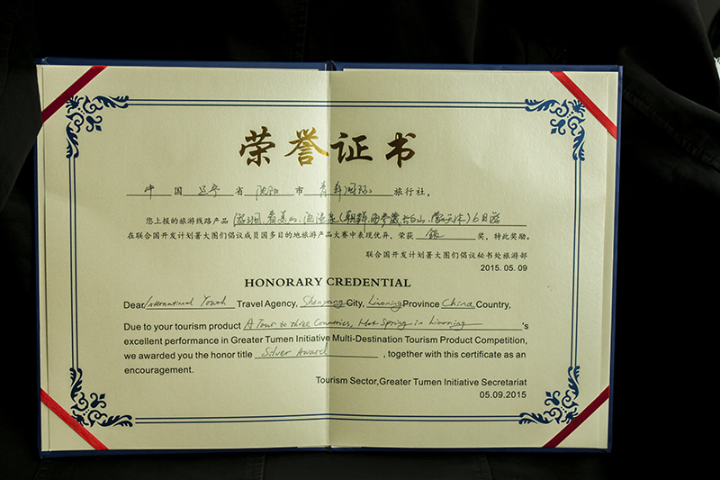 2015年5月9日 我社的旅游產(chǎn)品:游三國、看美山、泡溫泉、(朝鮮、海參崴、長白山、營口天沐)6日游 ,在聯(lián)合國開發(fā)計劃署大圖們倡議成員國多目的地旅游產(chǎn)品大賽中表現(xiàn)優(yōu)異,榮獲銀獎!