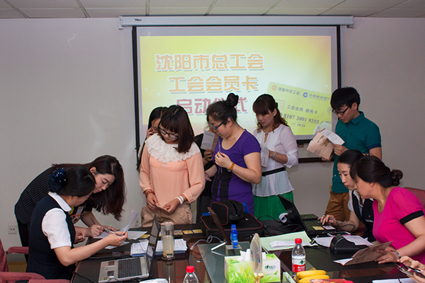 2015年6月1日,沈陽(yáng)市總工會(huì)會(huì)員服務(wù)卡領(lǐng)卡啟動(dòng)儀式在沈陽(yáng)青年國(guó)際旅行社舉行。沈陽(yáng)青旅員工積極辦理會(huì)員服務(wù)卡,現(xiàn)場(chǎng)氣氛嚴(yán)肅而又不失愉快。