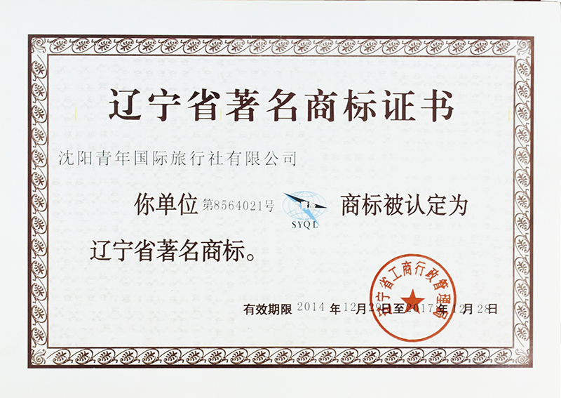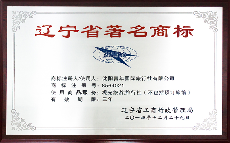 近日,我社成功獲得《遼寧省著名商標(biāo)證書》,沈陽(yáng)青年國(guó)際旅行社有限公司商標(biāo)被認(rèn)定為遼寧省著名商標(biāo)。