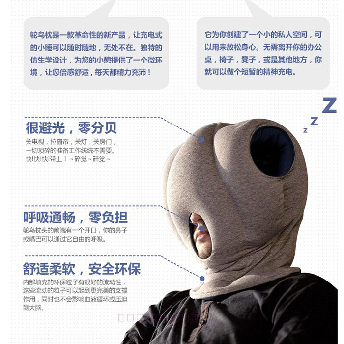 經(jīng)常外出坐硬座的朋友們都知道那是怎樣的一種煎熬,想睡又睡不好,不睡又挺不住,累啊,現(xiàn)在鴕鳥枕的發(fā)明讓您即使是坐著也一樣擁有好睡眠,火車,汽車,學(xué)生,上班族,只要是您人在旅途,鴕鳥枕頭都是您最好的選擇,為您隔絕噪雜混亂的環(huán)境,還您一個(gè)完美的睡眠!